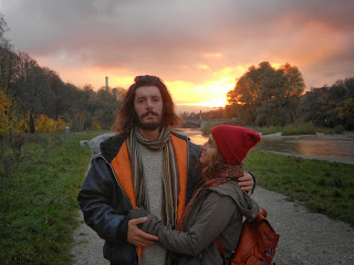As you can imagine we had a bit of a lie-in today. We had a late brunch which Daniel and Vanessa made for us - a traditional Barvarian breakfast of weisswurst (white sausage), a soft pretzel and sweet mustard (normally served with a beer, which we passed on.) It was a delicious breakfast and a great day spent relaxing in the warmth of the flat. In the afternoon we decided we should stop being so lazy and me, Pete and Daniel ventured out into the cold to find the market. We got the bus along to the river and had a really nice sunset stroll along the river banks and into the city. The evening was lovely and there were lots of bike riders and dog walkers out too. By the time we got to the market it was already dark, feeling christmassy again, and we had worked up our appetite. It was a produce market selling lots of good looking fruit and veg and cheese and meat. But they also had little food stalls where we sampled all the German cuisine - currywurst, pork belly, leberkäse (yummy liver thing), pickled herring and Daniel - the German - got a falafel! It also happened to be Saint Martin's day so there was a parade with loads of kids carrying paper lanterns and a good band following a guy on a horse. We watched them for a while and then found a small cafe and had a hot chocolate to warm up. Feeling worn out we got the underground back to the flat and had another lovely evening in (less drinking this time.)